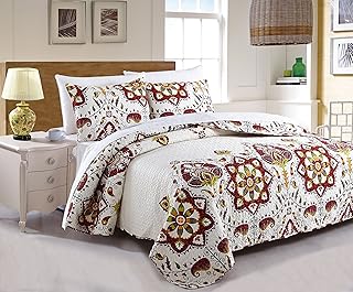 (Twin) - DaDa Bedding Collection Casablanca Elegant Bohemian Patchwork Quilted Bedspread Set - Bright Vibrant Floral Paisley Multi Colourful White & Red - Twin - 2-Pieces.