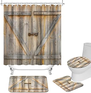 FuShvre 木製ドアシャワーカーテン4点セット ユニ ファブリック シャワーカーテンセット 滑り止めラグ付き トイレ蓋カバー バスマット 素朴なヴィンテージカーテン 浴室装飾フック付き