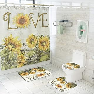 ひまわりシャワーカーテン4点セット ノンスリップラグ トイレ蓋カバー バスマット 耐久性 防水 ラブフラワー バスルームカーテン フック12個付き
