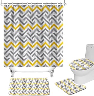 グレーとイエローシャワーカーテン4点セット ウェーブパターンシャワーカーテンセット 滑り止めラグ付き トイレ蓋カバー バスマット ユニセックス バスルーム装飾フック付き