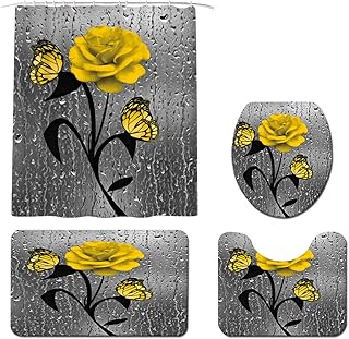 バタフライシャワーカーテンセット イエローローズフラワー ラグ付き トイレの蓋カバー バスマット シンプルなフローラルパターン モダン バスルーム ホームインテリア 4個パック