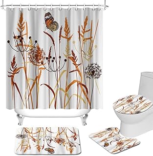 秋用シャワーカーテン4点セット オレンジブラウン 野生の草 タンポポポ バタフライシャワーカーテンセット 滑り止めラグ付き トイレ蓋カバー バスマット 自然植物 浴室の装飾フック付き