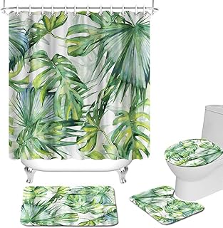 トロピカルリーフバスルームセット ヤシの葉シャワーカーテンセット 滑り止めラグ付き トイレ蓋カバー バスマット ユニセックス バスルーム装飾フック付き グリーン 4点セット