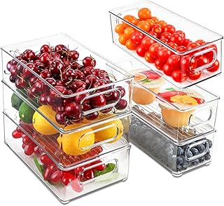 冷蔵庫オーガナイザービン 6個セット - ハンドル付きスタッカブルストレージビン 冷凍庫 キッチン カウンタートップ キャビネット パントリー食品ストレージ - クリアプラスチックオーガナイザービン